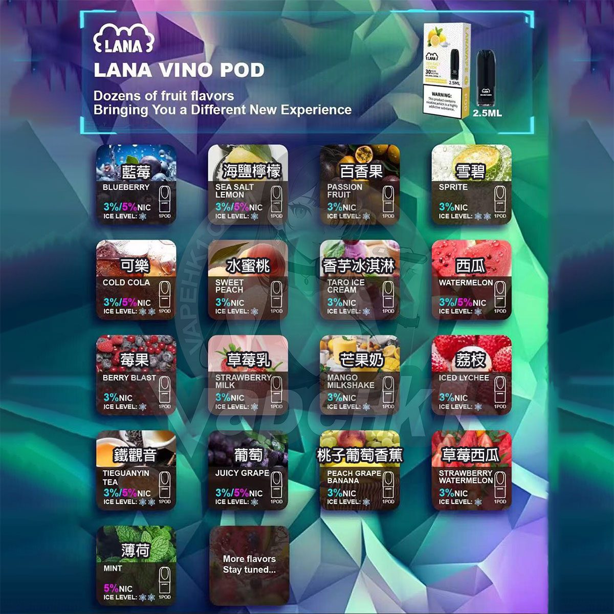 - LANA VINO POD所用的材料非常講究。摒棄傳統廉價的棉芯加熱技術,採用最新陶瓷芯加熱,確保霧化的口感。同時對封油技術進行了改進,大大保證了漏油的情況發生。確保更舒適、安全的使用者體驗